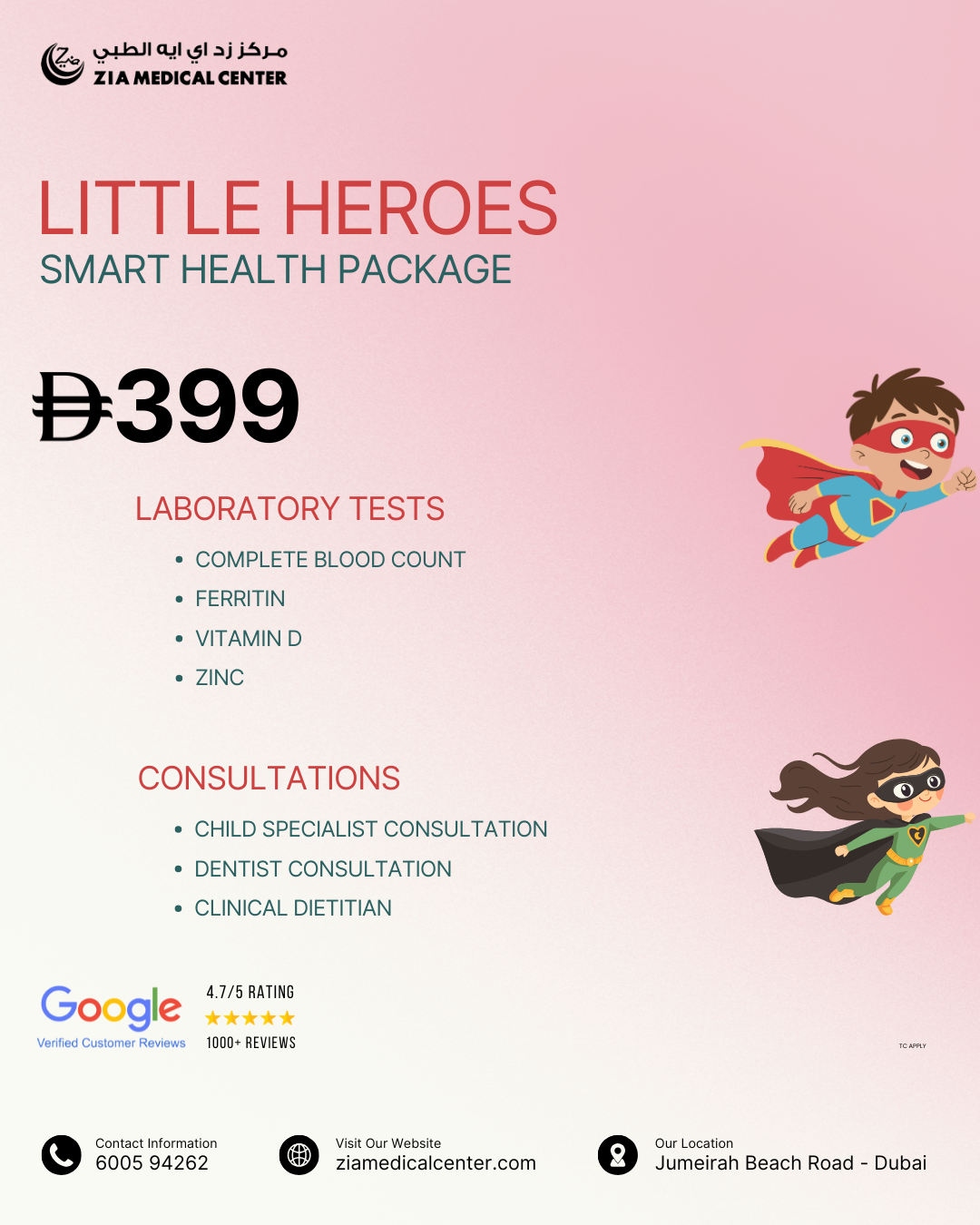 Opting for the Basic Wellness Child Package comes with a host of advantages. Firstly, it offers a comprehensive assessment that delves into various aspects of your child’s health, providing a well-rounded view of their overall well-being. One of the key benefits is the early detection of potential health issues. By identifying these concerns at an early stage, the package enables timely intervention and preventive measures, ensuring your child’s health is on the right track. Moreover, the package includes consultations with our specialists, granting you access to expert guidance that can prove invaluable in understanding and enhancing your child’s health and development journey. The convenience factor is also noteworthy, as all necessary tests and consultations at Zia Medical Center in Dubai are conveniently bundled together in a single package, saving you both time and effort. Last but not least, the personalized care your child receives through this package is exceptional. With our specialists having a comprehensive overview of your child’s health, they can provide advice that is tailored to your child’s unique and specific needs, making this package a well-rounded and thoughtful choice for any parent.